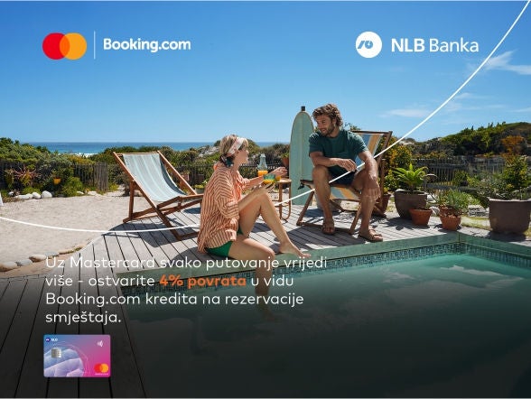 Rezervišite smještaj na Booking.com uz NLB Mastercard karticu i ostvarite 4% povrata u obliku kredita koje možete potrošiti na buduće rezervacije smještaja.