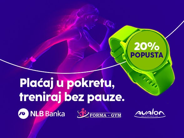 Ostvarite 20% popusta na redovne cijene mjesečnih članarina u Avalon Sports & Health Club fitness centru u shopping centru Alta u Sarajevu i u Forma Gym teretanama u Tuzli plaćanjem NLB platnim karticama putem svog pametnog sata i Goole Pay, Apple Pay ili Garmin Pay usluge!